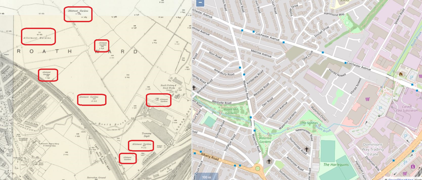 Allotment gardens used to be fairly well scattered throughout Roath.  I suspect that they were mostly established on land earmarked for a different purpose and disappeared with the building of Eastern Avenue, Howardian School, Timbers Square, Melrose Avenue …until now there are no allotments left in Roath, the nearest being visible from Allensbank Road where it crosses Eastern Ave or on Highfields Road near its junction with Lake Road West.