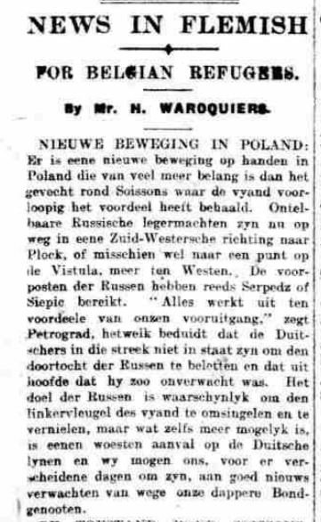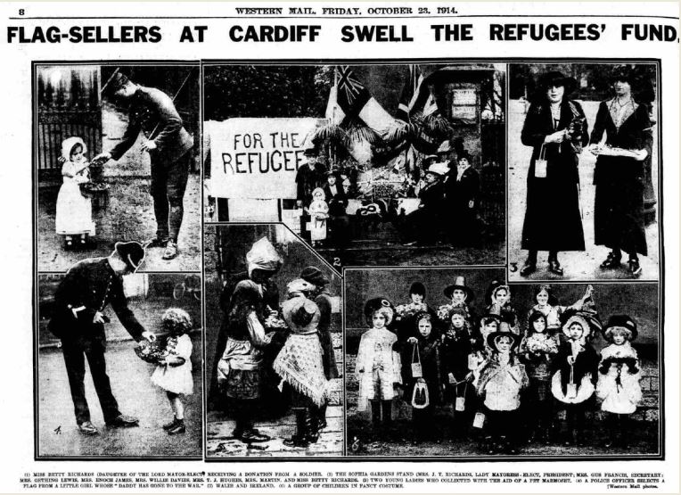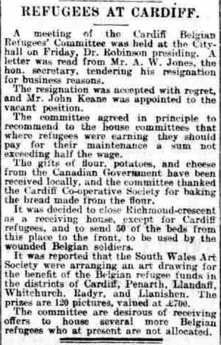 In Wales, some 4,500 refugees were accommodated, whilst Lord Bute offered to find homes for 3000 refugees in Cardiff and on Rothsay. Towns including Cardigan, Aberaeron, Lladysul, Lampeter and Barmouth all invited Belgian refugees. The Davies sisters of Gregynog (the daughters of David Davies the entrepreneur who developed Barry Docks) recruited 91 of what they termed “a better class of refugee”, mainly artists and musicians, and set them up in Aberystwyth and Barry, hoping to enrich the cultural life of Wales, with a degree of success. The Western Mail ran a column in Flemish and a Belgian primary school was set up at 9 Richmond Road.