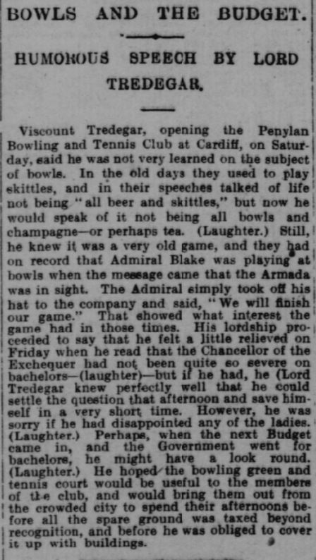 The Penylan Club was opened on May 1st 1909 by Lord Tredegar. His speech was hailed as humorous by the Western Mail: