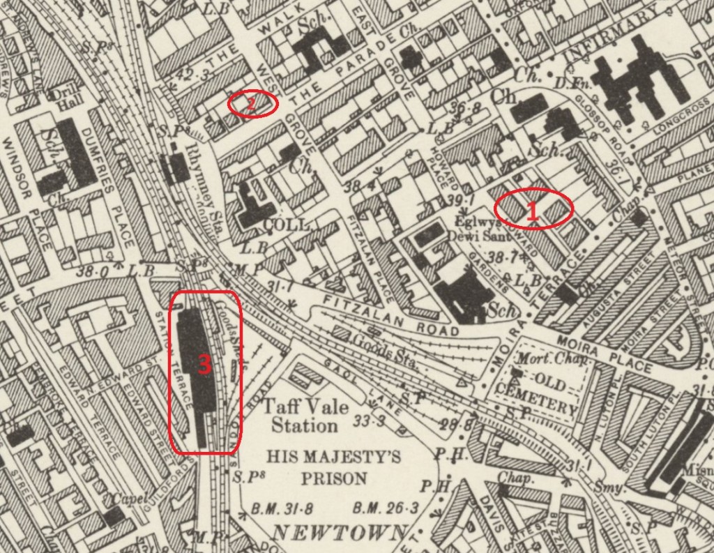 1. Howard Terrace, home of the Leyshon family. 2. Monkton House School 3. Taff Vale Station