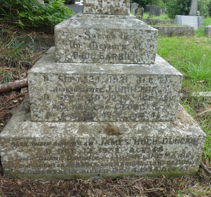Barbier grave at Cathays Cemetery with tragic death of Jaqueline Marie De Guelis remembered on the bottom three lines.