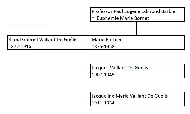 Jacques Theodoule Paul Marie Vaillant de Guélis was born on 6 Apr 1907. Jacques went to school in Wrekin College, Shropshire before going onto Magdalen College, Oxford. He had dual French/British nationality, and was therefore required to undertake French national service which he did with the French Cuirassiers in the 1930s. At the time of Jacqueline’s death in 1934 Jacques was reported to be the director of the press advertising firm in Paris. He married Beryl Richardson at St Augustine’s church, Kensington, London on 26 Feb 1938 after which both Jacques and Beryl worked in press advertising in London. He had a handle-bar moustache and was 6 feet 4 inches tall.