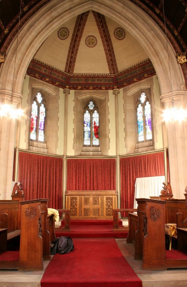 The old Cardiff Royal Infirmary chapel. The Litany desks are seen left and right next to the choir stalls.