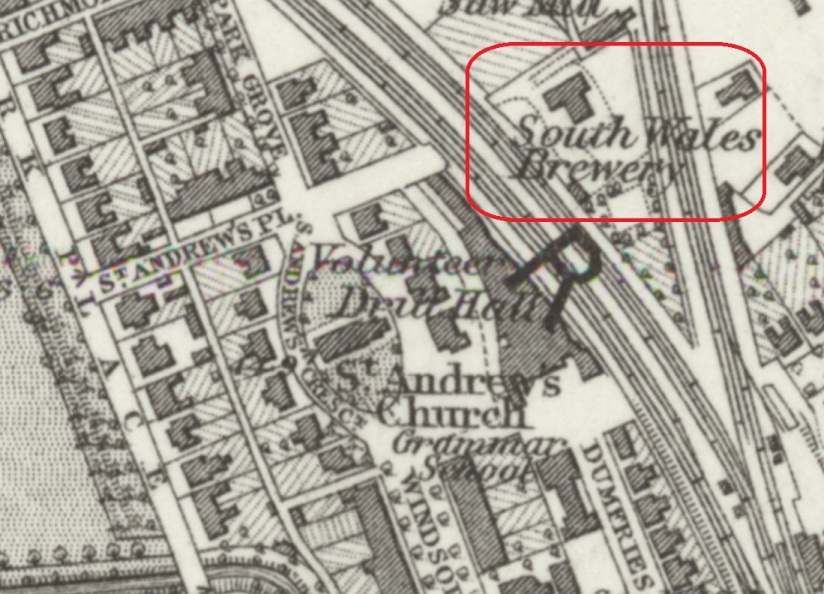 The South Wales Brewery was owned by John Biggs and a John Vaughan Williams. There would also have been a number of hotels/pubs owned by the brewery. One was the Theater Royal Hotel at the southern end of Queen Street. I have discovered an old picture of the hotel with an advertising hording for the South Wales Brewery.