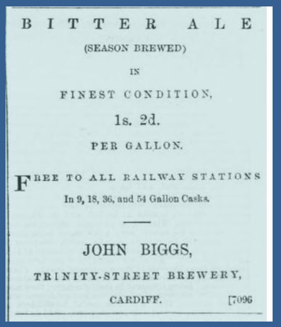 Trinity Street Brewery, Cardiff, brewery owned by John Biggs, advert from 1872