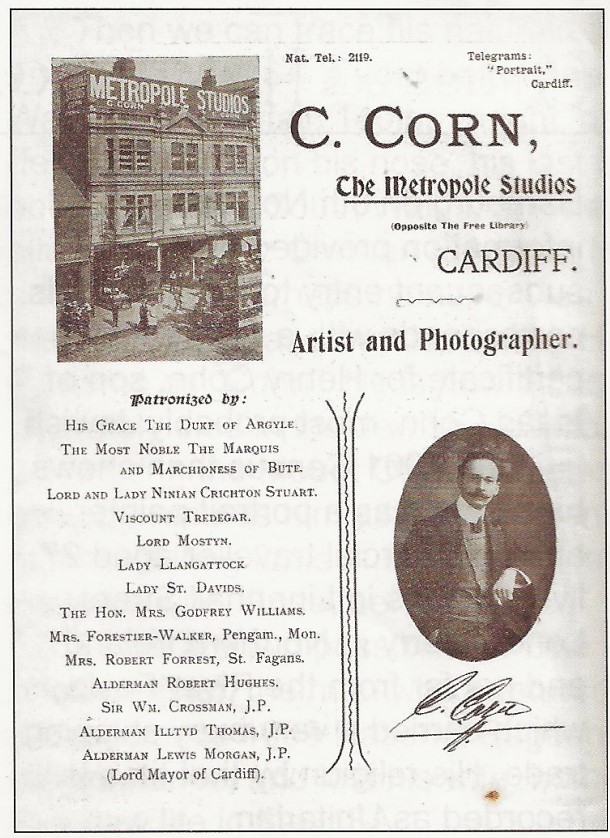 Henry Corn’s Metropole Studios were in an up-and-coming part of Cardiff, the heart of its retail shopping and the scene of a titanic commercial battle between the two competitive drapers, James Howell and David Morgan. Morgan’s investment in shops and arcades had raised the social status of the Hayes buildings but James Howell was a prominent backer of the pageant. And, as we have already witnessed, Corn had made acquaintance with the cream of contemporary Welsh society, and must have spent quite some time with them in his studio. Indeed, his advert in the Pageant’s “Book of the Words” lays emphasis on how much he was patronized by the nobility as well as local political grandees. The list of patrons, as you can see from his advertisement, included The Duke of Argyll, the Marquis and Marchioness of Bute, Viscount Tredegar, Lord and Lady Crichton Stewart, the Lord Mayor and Mayoress of Cardiff, several Aldermen, JP’s and so on.
