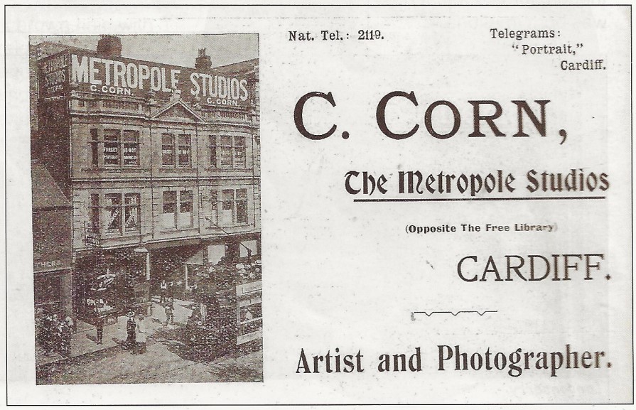 Mildly surprising though was the fact that, apart from his advertising of the studio Corn does not seem to appear in the local press. He keeps a low profile. The 1911 Census shows a Henry Corn living with his wife, Annie, and servant in 6 Ty-Draw Place in a 7 roomed property in Roath. This part of Roath would probably be considered upper middle-class suburb in the period, reflecting a comfortable lifestyle.