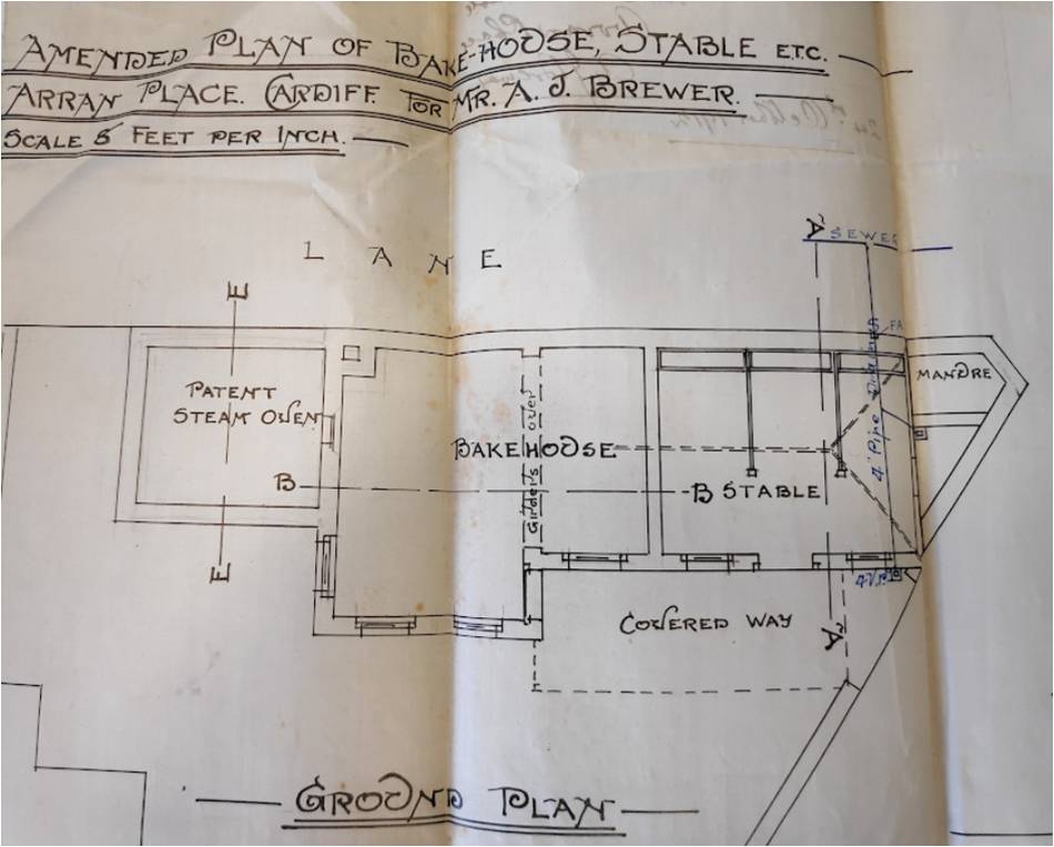 The bakery was established in 1912/1913 as a purpose-built bakehouse, around the time that the houses on Arran Place and Roath Court Road were being constructed. The developer was the 39 year-old Arthur John Brewer, a master baker, who lived at 135 Monthermer Road in Cathays. The architects were William Ware and Williams, who had been engaged by the Roath Court Estate to design many of the houses in the area.