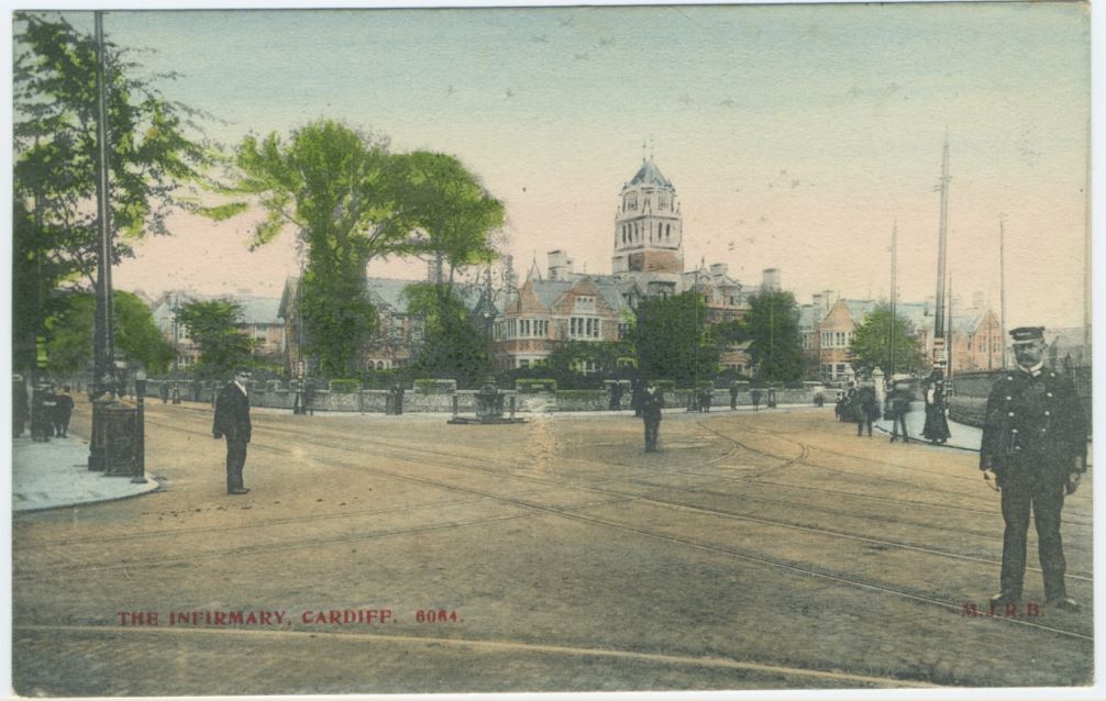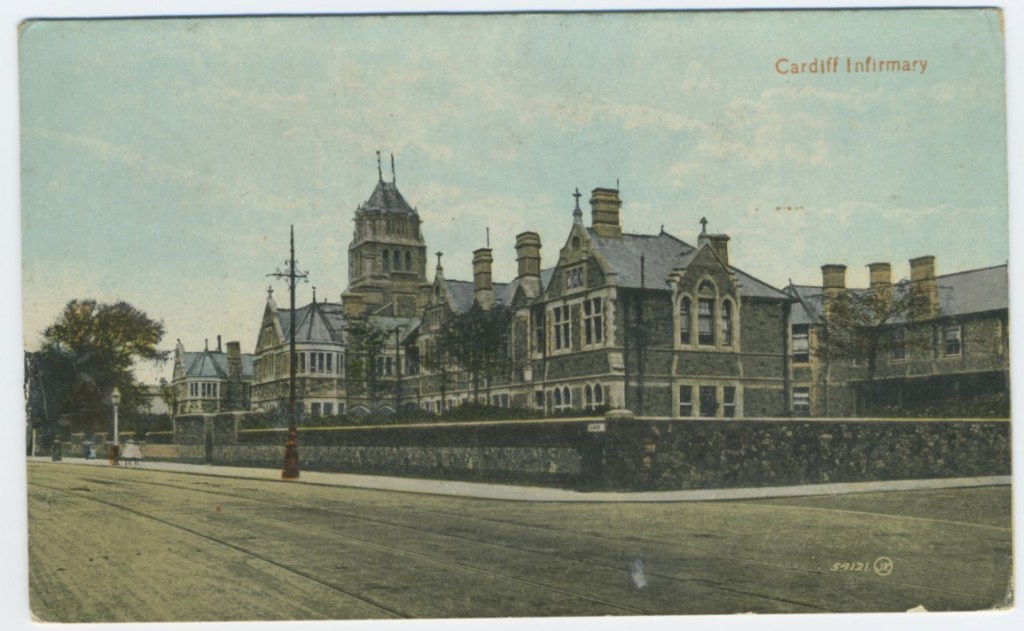The barracks were demolished in 1880 and the Infirmary opened in 1883 at a cost of £23,000 and then called the Glamorgan and Monmouthshire Infirmary and Dispensary. It was renamed Cardiff Infirmary in 1895 and King Edward VII Hospital in 1911 and from 1923 Cardiff Royal Infirmary.
