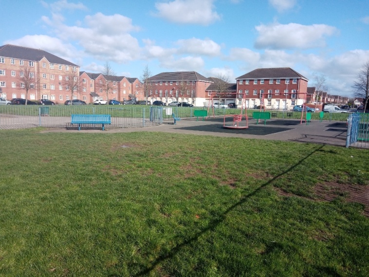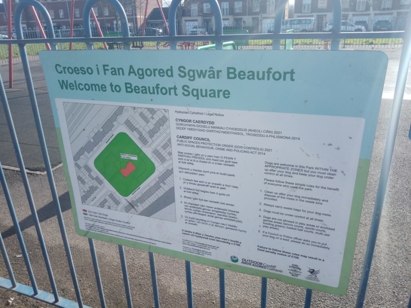 Beaufort Square park is in the centre of a modern housing development north of Rover Way in Tremorfa. The houses/apartments were built in the early 2000s.