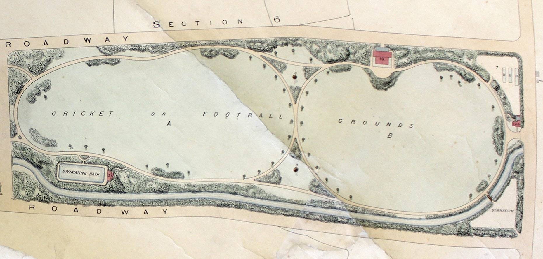 A 1892 plan of the Recreation Ground. The stream ended up being diverted to the north of the Rec rather than the south.