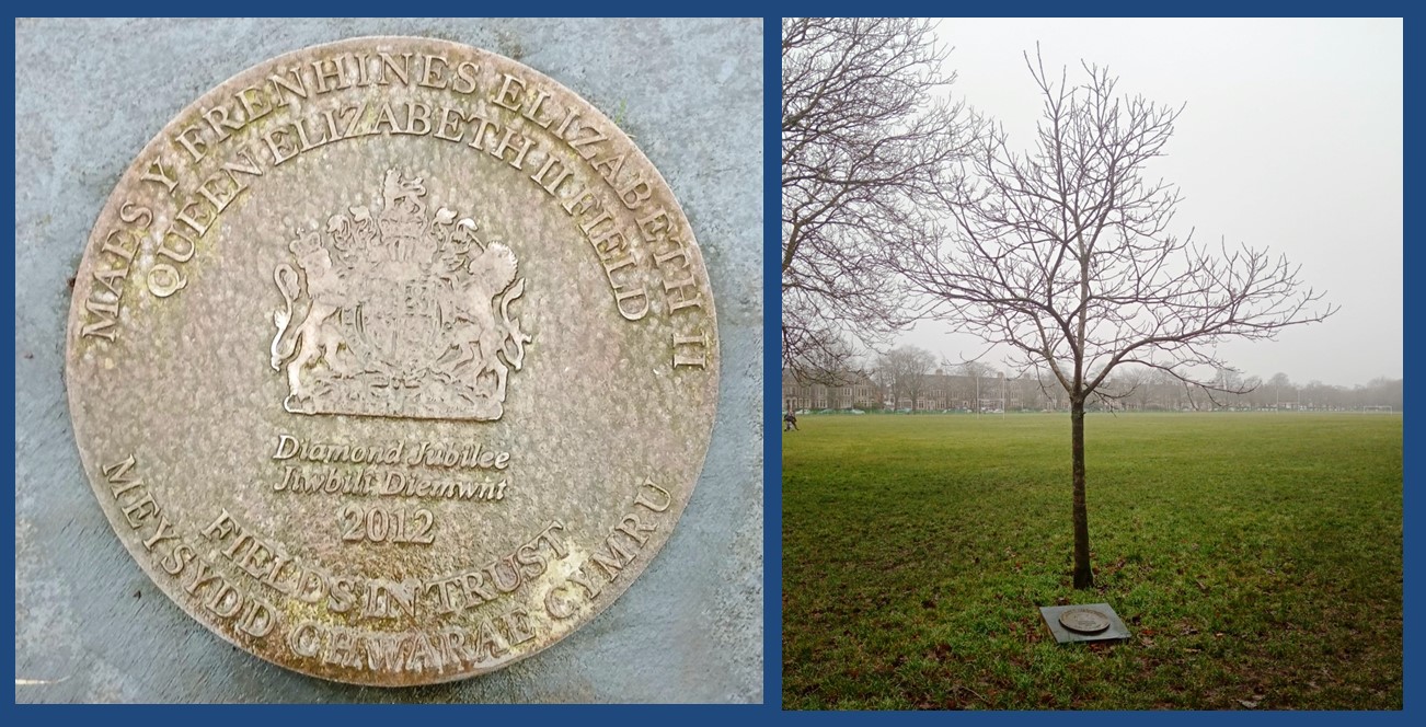 In 2012 a tree was planted and a plaque laid in the NE corner to commemorate the Queen’s Diamond Jubilee and dedicate Roath Park Rec as a Queen Elizabeth Field. The initiative was part of the work of the charity Fields in Trust. (pics taken Dec 2024)