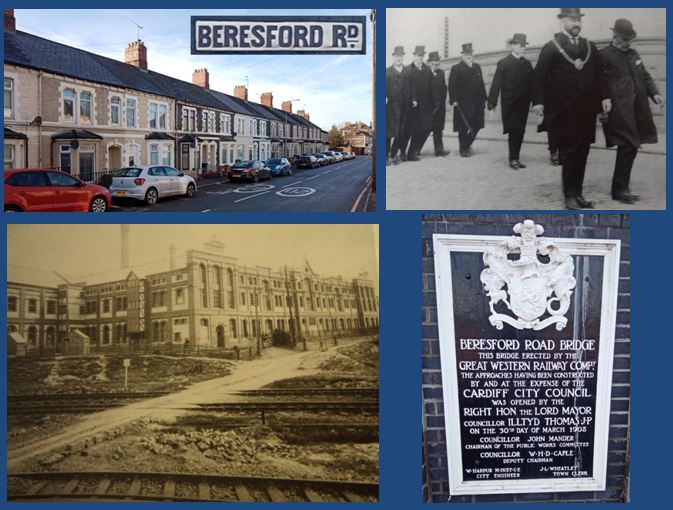 Dates from 1887, originally called Spring Gardens Road. It is probably named after John Beresford Bradley (1886-1958), nephew of the William Bradley, a solicitor and owner on the Bradley estate on which the roads were built. The Beresford Road Bridge was opened in 1908 and had been built in response to large number of accidents to people crossing the railway line. The bridge had been a long time coming. An article in the papers of 1897 reported that several owners of property nearby had been contacted asking about contributing towards a bridge. Spillers & Nephews biscuit factory refused and said they were more likely to sue the corporation for damages for not building a bridge. The bridge was reconstructed in 2016/7 as part of the South Wales Mainline electrification process.