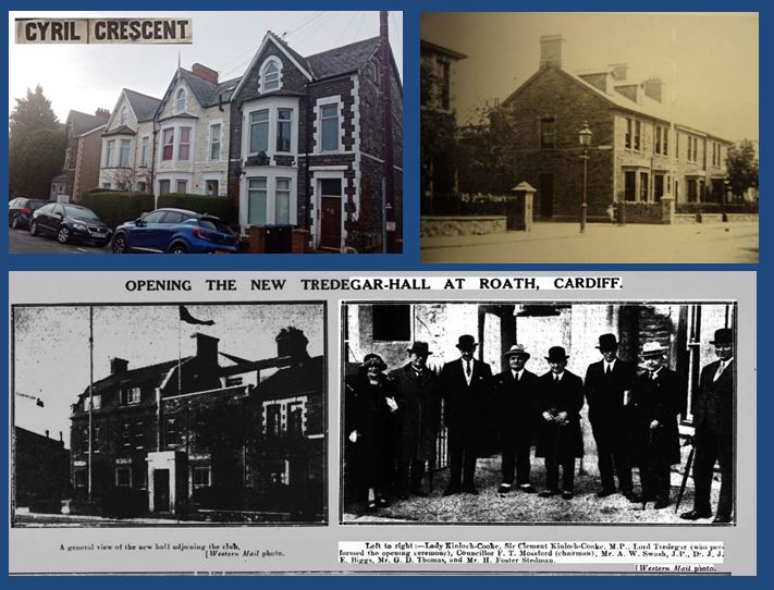 Cyril Crescent dates from 1873. The name derives from landowner Reverend John Thomas Cyril Stacey. Tredegar Hall, the Roath Conservative Club, was opened 1926 by Lord Tredegar and was a conversion of existing houses shown in the 1891 photograph. Also present in the photograph of the opening of the club is Dr J.J.E.Biggs, a surgeon who went on to become Lord Mayor and was one eldest of the Biggs rugby playing brothers. All six of them played for Cardiff and Norman Biggs being the youngest player to play for Wales.