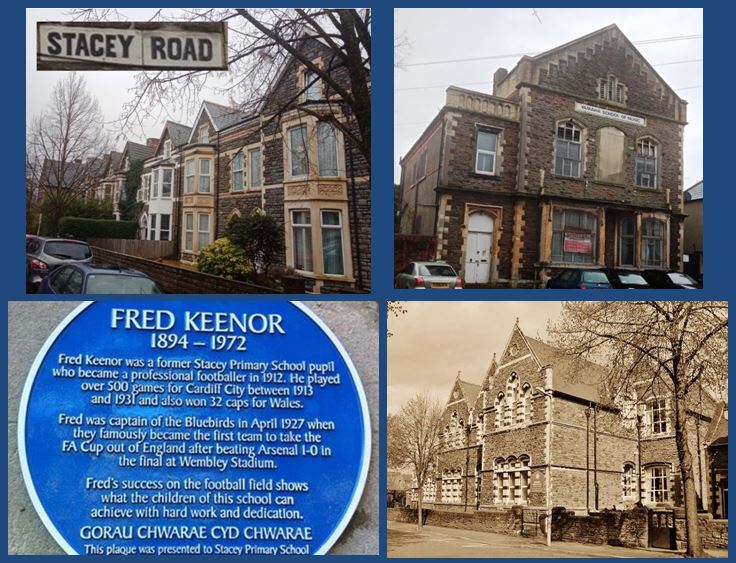 Dates from 1875. Named after Reverend Thomas Stacey, the landowner of Island Farm which lay in the triangle of land between Newport Road and Broadway. Stacey Road School, opened in 1892 and has a blue plaque to footballer Fred Keenor. Stacey Hall was once an Electric Theatre and also a library but strangely not a church even though it has an appearance of one.