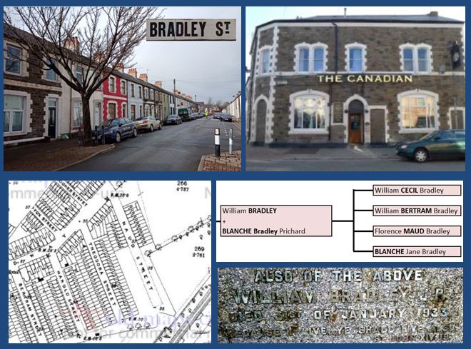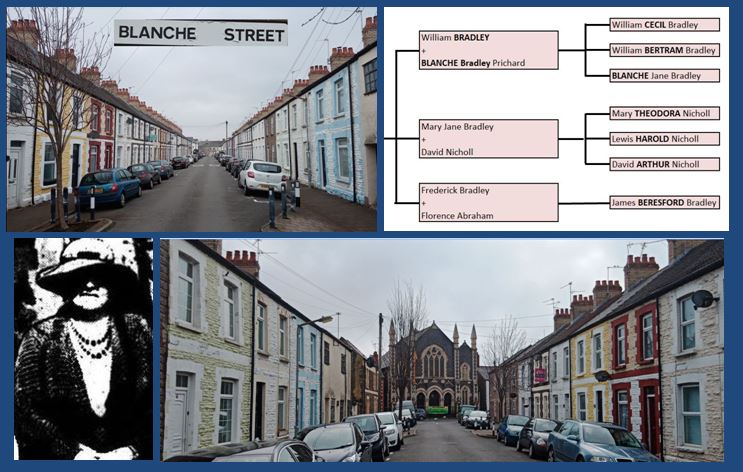 Dates from 1882. When the landowner William Bradley married Blanche Bradley Pritchard (probably a cousin) in 1871 she became Blanche Bradley Bradley. The street however probably named after their daughter, Blanche Jane Bradley (1878-1948). She grew up in Cathedral Road. She never married and went on to live with her unmarried sister Florence in Fairwood, a large house on Llantrisant Road, Llandaff. The sisters would hold annual garden parties for the Conservative party. When she died in 1948 she left £88K (~£3million today) to her sister. At the end of the street is Cardiff Sikh Gurdwara temple that used to be Ebenezer Baptist Church.