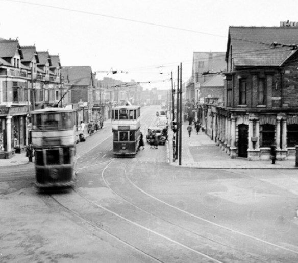 1949 Tram exiting City Road onto Newport Road in 1949. Roath Road Wesleyan church on the left and Lloyds Bank on the right – both now gone