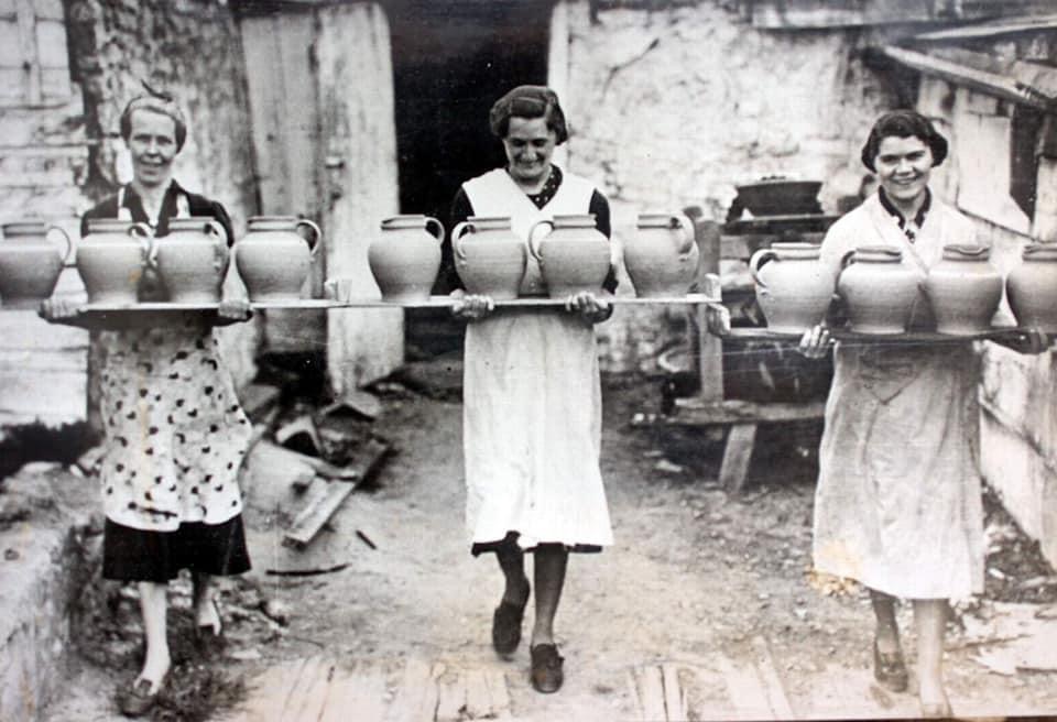 Newport Road just before the Rumney River bridge. Taken from the new pedestrian bridge in 1968. The flyover now blocks this view and the pedestrian bridge is no longer there. Rumney Pottery, just on the east side of the River Rhymney and therefore just outside the old parish of Roath. The Giles Ladies, the owner Vera centre, with Pearl left and Renee right of Rumney pottery, photographed in 1932 (photo credit – Giles family).