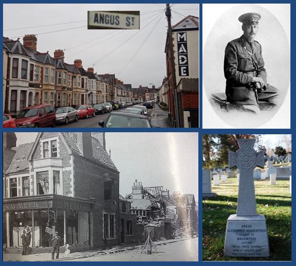 Dates from 1891. Suffered bomb damage in WWII blitz. Named after Angus Alexander Mackintosh, heir to the Mackintosh estate who was born at Moy Hall in Scotland, grew up in Cottrell Hall, St Nicholas, Glamorgan. A military man, injured in WWI at Ypres, Belgium in 1914. He was evacuated to the military hospital at Boulogne, where he was treated before being sent to hospital in England in mid-November. After spending six months in hospital recuperating and being promoted to Captain he was appointed as the aide-de-camp to Prince Arthur, the Governor General of Canada in Oct 1915. A year later the Governor General of Canada was replaced by Victor Cavendish, Duke of Devonshire but Angus Mackintosh stayed in his role as aide-de-camp. The Duke of Devonshire was accompanied to Canada by his family and Angus Mackintosh and the Duke’s daughter, Maud Cavendish, fell in love and were married at Christ Church Cathedral, Ottawa in Nov 1917. They moved to Washington DC where Angus was appointed Honorary Assistant Military Attaché in the British War Mission. A few weeks after the birth of their daughter Anne Peace Arabella Mackintosh, Angus caught the Spanish flu and died of pneumonia on 13 Oct 1918 aged 33. He is buried at Arlington National Cemetery, Virginia, USA.