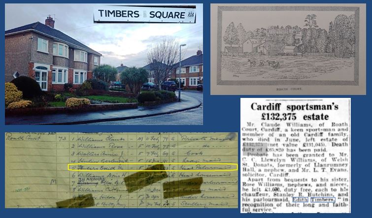 Built around 1955 on Roath Court pleasure garden, land that belonged to the Roath Court estate. Named after Miss Edith Timbers (1901-63) who was head parlour maid at Roath Court House (now the funeral home) for around thirty years. In 1952 she was left £1000 in the will of Claude Williams of Roath Court in recognition of her long and faithful service. Roath Court was sold in 1953 and Edith returned to the village where she grew up, Whitney-on-Wye, Herefordshire. She died ten years later aged 62 and left £1093 in her will, almost as if her gift had remained untouched.