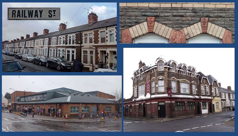 The houses on Railway Street date from 1881, some 30 years after the adjacent South Wales Railway line opened in 1850 – originally a broad gauge railway, later converted to standard gauge. The original pubs and churches on the street are now gone. The street has the longest unbroken linked terrace of houses in Cardiff , some ninety five in total stretching over 500 metres. It also has a big community-led initiative happening at Railway Gardens. In 2021 the Community Health Centre on the corner with Splott Road is being used as a mass Covid-19 Vaccination Centre.