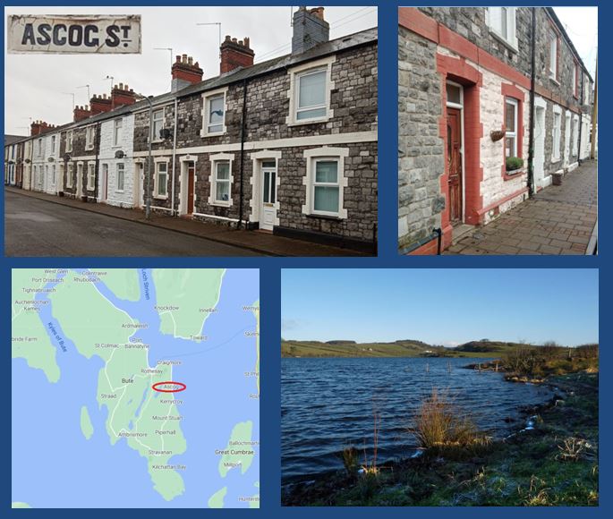 Some houses built pre-1880. Built on land owned by the Marquess of Bute by Cardiff Workmen’s Cottage Co. Named after Ascog on the Isle of Bute, not far from the ancestral home of the Bute family at Rothesay. Loch Ascog looks inviting.
