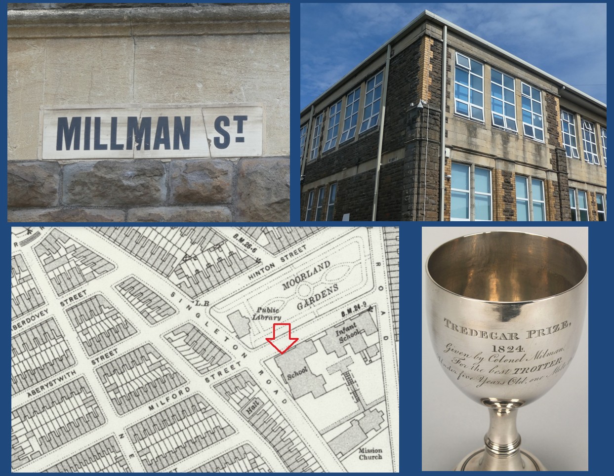 Millman Street, one that no longer exists, ran between Mooland Primary and Splott Library, but never had any houses built on it. Blocked off after WWII but the sign is still present on side of school. Named after the Millman family who married into Lord Tredegar’s family who owned the land here (note Millman seems to be spelt sometimes with one ‘l’ and sometimes with two. There is a Milman Street in Newport – that one has houses on it. There was a Tredegar Cup awarded to the best trotter in 1824 came up for auction in USA and went for $290.