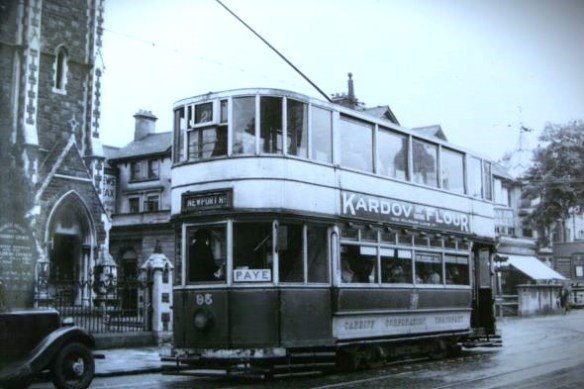 Tram on Newport Road passing Roath Road Methodist Chapel at City Road junction in around 1938.