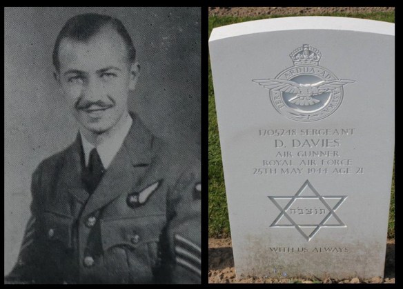 Dennis Davies was born on 10 Sep 1922 in Cardiff (registered at birth as Denis) to Mark Davies, who worked as an agent for a clean towel company and later as a tobacconist and Edith Alice Davies née Caldwell, both originally from Manchester. In 1939 Dennis was working as traveller (general fabrics) and living at Melrose Court, Penhill Road, Llandaff with his father. He later lived at 12 Insole Grove East. In WWII he served as a Sergeant with the Royal Air Force Volunteer Reserve. He was killed on 25 May 1944, aged 21. He was a rear gunner on a Halifax Mk III which had taken off from RAF Lissett, Yorkshire and intercepted and shot down at night 30 km north of Aachen. Three of the crew were killed and the other four taken prisoner. He is buried at Rheinberg War Cemetery (grave 11.C.21). He is remembered on a memorial at the Cardiff United Synagogue. Commonwealth War Graves Commission record.