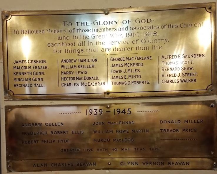 The City United Reformed Church in Windsor Place, Cardiff, has a WWI and a WWII war memorial plaque on display.
