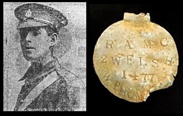 William John Thomas was born in Radyr, Cardiff in 1893 to John Thomas, a railway worker, originally from Radyr, and Ester Annie Thomas née Noote, originally from Cardiff. In 1901 the was living at 44 Harriet Street, Cathays with his parents and brother and sister. In 1911 he was living at 56 Thesiger Street, Cathays with his step-mother Mary Thomas. Before the war he worked as a crane diver at the Dowlais-Cardiff steelworks. He joined the 2nd Welsh Field Ambulance before war began. He died in the Gallipoli of wounds received on 13 Aug 1915 aged 22. He is buried at Hill 10 Cemetery, Suvla, Gallipoli, Turkey (plot I. C. 12.). In 2021 a metal detectorist discovered an ID tag belonging to William Thomas in a field near Henley, Suffolk. The article says William Thomas served on the hospital ship HMS Sulva. The article also puts forward possibilities as to why his tag may have ended up in Suffolk saying it may have been lost when he might have been posted to Shrubland Hall, which is quite near to where it was found and was requisitioned as a military hospital or another theory is it may have been lost when he was visiting a girlfriend in the Cambridge area. He is remembered on the Dowlais-Cardiff Guest Keen & Nettlefolds war memorial plaque. Commonwealth War Graves Commission record.