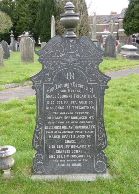 Ernest William Tregarthen was born in Cardiff on 27 Jan 1888 to Charles Tregarthen, a publican, originally from the Scilly Isles and Grace Osborne Tregarthen née Boase, originally from St Ives, Cornwall. At the time of the 1891 census the family were living at the Macworth Hotel, Neath, where Charles was the licensed victualler. By 1894 the family had returned to Cardiff and were living at 121 Richards Street and Ernest and his brother Thomas were admitted to Albany Road School. His father died in 1896 and in 1901 the family were living at 73 Alfred Street. Ernest went on to attend Howard Gardens School. In 1911 Ernest was living at 5 Westville Road with his mother and sister and working as a shipping clerk. In WWI he trained with the Inns of Court Officer Training Corps and then served with the 5th Battalion, Royal Welsh Fusiliers from Jul 1916 and then the Royal Flying Corps from Nov 1917. He died on 18 Mar 1918 aged 30 as a result of a flying accident at Thetford, Norfolk in which his aircraft spun off a turn at low altitude. He is buried in a family plot at Cathays Cemetery (plot U.65). He is remembered on the Roath Park Wesleyan Church War Memorial, Howard Gardens High School War Memorial and the Cardiff Coal Exchange War Memorial plaque. Commonwealth War Graves Commission record.