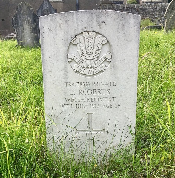 John Roberts was born in 1893 in Groeswen, Glamorgan to Thomas Roberts, a road labourer and grave digger and Sarah Roberts née Williams, both originally from Groeswen, Glamorgan. In 1911, at the age of 18, John was living in the family home and working as a coal miner. He signed up on 26 Jun 1917 in Caerphilly. His army records show he was 5ft ½in with a 30in chest and gave his occupation as a farm labourer. When he joined up he assigned to the 66th Training Reserve Battalion. He took his own life on 18 Jul 1917 after being in the army for less than a month. He was aged 25. His body was found on a railway near Oswestry near to his army camp. Witness statements at his inquest make sad reading. He has reportedly said to colleagues he had been kicked by a horse prior to joining up and had pains in his head. Prior to his disappearance he had stated he was tired of army life and looked weary. He had been recommended for medical discharge on the basis of being medically unfit to serve, as early as 30 Jun. He is buried at Groeswen Welsh Congregational Chapel. Commonwealth War Graves Commission record. There is a possibility he is the John Roberts named on the war memorial in Pembroke Terrace Welsh Calvinistic Methodist chapel, the thinking being that the chapel in Groeswen may have been on the same circuit.