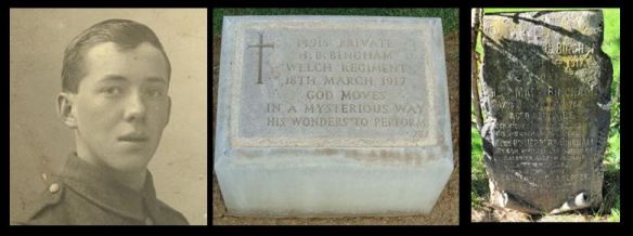 Herbert Barney Bingham was born on 26 Jun 1894 in Norwich to Herbert John Bingham, a commercial traveller for a chocolate manufacturer, originally from Bruston, Norfolk and Catherine Charlotte Bingham née Browne, originally from Norwich. The Bingham family moved to Cardiff around 1904 and in 1911 were living at 119 Claude Road and Hubert, aged 16, was working as an insurance clerk. They later moved to 6 Penylan Road. In WWI he served as a Private in the 11th Battalion, Welsh Regiment. He died of the effects of gas shells in Salonika, Greece on 18 March 1917 aged 22. He is buried in Karasouli Military Cemetery in Greece (plot D. 787). Herbert is remembered on the Broadway Methodist church memorial plaque at Trinity church and the Plasnewydd Presbyterian Church WWI memorial. He is also remembered on his parents headstone in Cathays Cemetery. Commonwealth War Graves Commission record. His father died in June the same year.