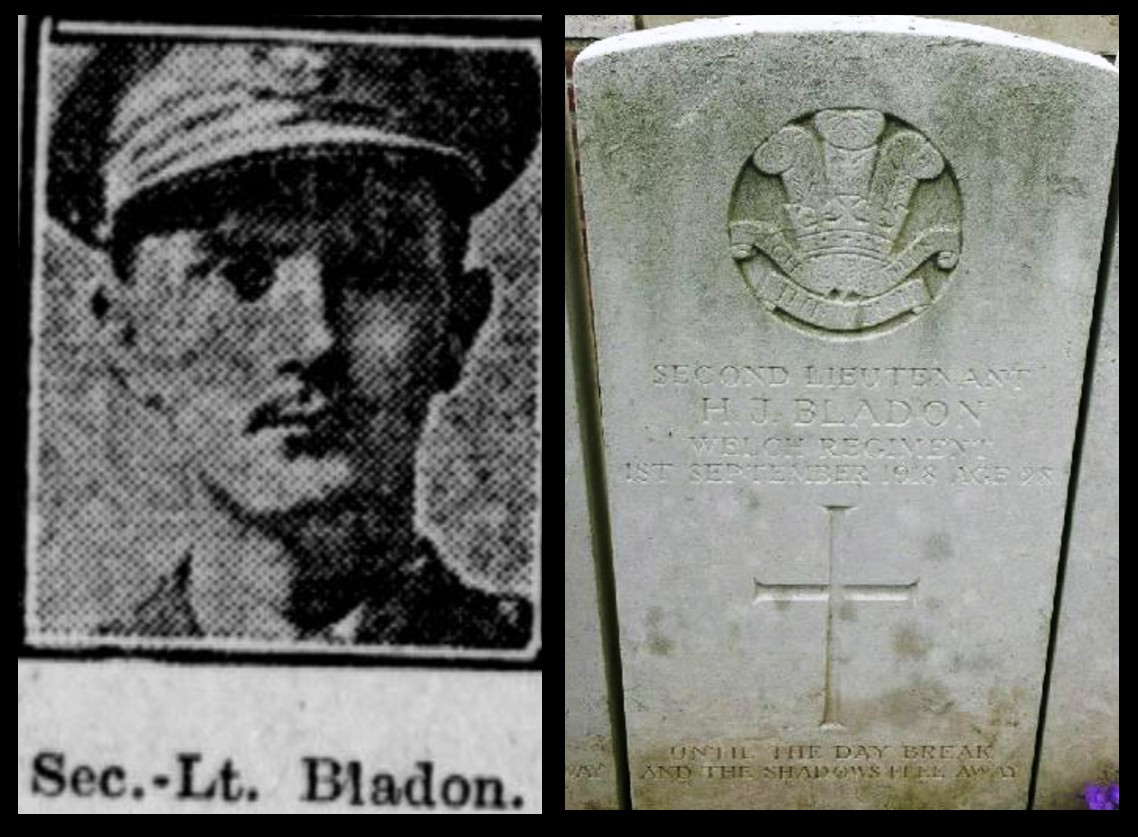 Henry ‘Harry’ James Bladon was born in Cardiff on 18 Apr 1890 to James Bladon, a railway clerk, originally from Shirenewton, Gloucestershire and Mary Jane Bladon née James, originally from Dinas Powys. In the census return of 1891 the family lived at 34 Glenroy Street and in the 1901 and 1911 returns at 8 Glenroy Street. After leaving school Harry worked as the Private Secretary to Lord Glanely, the ship owner William Tatum. Prior to the war he had also been in the Glamorgan Yeomanry. In 1917 he married Grace Lewis , a teacher, originally from Cardiff, who lived at 18 Albany Road. In WWI he served as a Second Lieutenant, 4th Battalion (Territorial Army), Welsh Regiment. He died of wounds on 1 Sep 1918 on the Western Front, aged 28. He is buried at the Morval British Cemetery, France (grave B.22). He is remembered on the Plasnewydd Presbyterian Church War Memorial, Keppoch Street. Commonwealth War Graves Commission record.