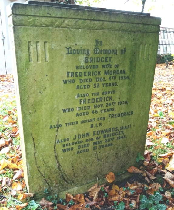 John Edwards was born in Cardiff on 10 Feb 1914 to Joseph Edwards, a dock labourer, originally from Hereford and Bridget Edwards née Aherne originally from Cardiff. His father Joseph died in WWI on the last day of the war in Mesopotamia when serving with the Essex Regiment. Bridget remarried to Frederick Morgan. The family lived at 42 Ordell Street, Splott and John still lived there in 1939 and was working as a steel erector. In WWII he was with the Royal Air Force Volunteer Reserve serving with the 6297 Servicing Echelon which was formed at Brize Norton, Oxfordshire in Mar 1944 to service No 297 Squadron’s Albemarles and later its Halifaxes. It moved to Earls Colne, Essex in Sep 1944. John was admitted to hospital at RAF St Athan when home on leave where he died of toxic jaundice on 28 May 1945, aged 31. He is buried at Cathays Cemetery (grave R2580). Commonwealth War Graves Commission record.
