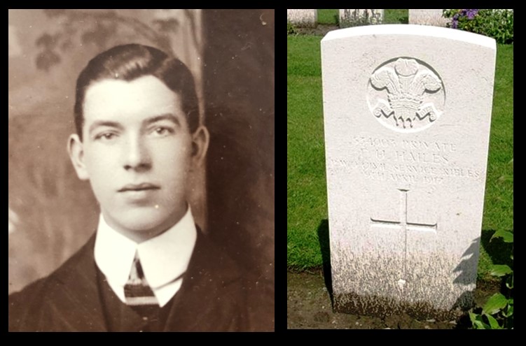 Frank Uriah Hailes was born in Cardiff on 22 May 1889 to John Hailes, a furniture remover, originally from Cardiff and Eliza Ann Hailes nèe Walland originally from Silverton, Devon. At the time of the 1891 and 1901 census the Hailes family lived at 8 System Street, Adamsdown. Frank attended Adamsdown Board School and then Howard Gardens School from 1901 to 1903. The family moved to 53 Alfred Street, Roath and Frank worked as a shorthand typist/clerk for Morgan Wakley & Co, coal exporters/brokers in Cardiff Docks. In the summer of 1914 he married Madeline Blanche Clargo, a Post Office telephonist and they lived at 152 Kimberley Road, Penylan. In WWI Frank served as a Private with the 15th Battalion, London Regiment, (Prince of Wales’ Own Civil Service Rifles). He was killed in action on the Western Front in Belgium on 9 Apr 1917, aged 27. He is buried at Bedford House Cemetery, Belgium (Enclosure No.4 I.I.42). He is remembered on the St James the Great War Memorial plaque, now at St John’s church. Commonwealth War Graves Commission record. There is also a memorial to the 15th Battalion London Regiment outside Somerset House, London. (Frank’s brother Sydney assisted Marconi in sending the first telegraph messages over water in 1897).
