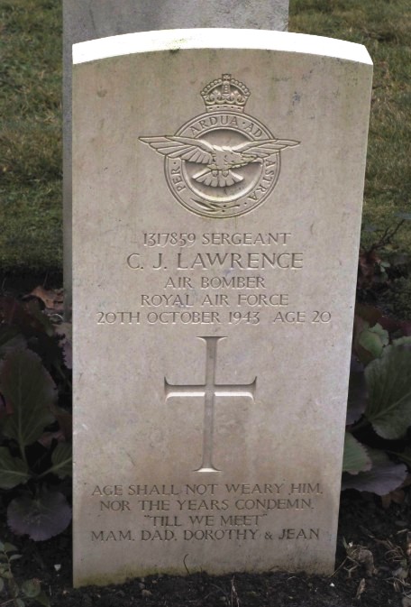 Cyril John Lawrence was born in Cardiff on 23 March 1923 to John Aaron Lawrence, a coal haulier and Florence Louise Lawrence nèe Marks, both originally from Cardiff. He was baptized at St Saviour’s church, Splott, on 26 Apr 1923 when the family were living at 64 Marion Street. By 1931 the family were living at 38 Spring Gardens Place and Cyril was working as an accounts clerk for the Great Western Railway Company. In WWII he joined the Royal Air Force Volunteer Reserve. He was killed, aged 20, when his aircraft, Avro Lancaster Mark III bomber LM341 crashed near Köthen crashed on 20 Oct 1943 when involved in a bombing raid over Leipzig. Their aircraft encountered very severe icing followed by a steep dive and total loss of control. Six of the crew were killed, including Cyril, and one parachuted to the ground before being taken prisoner. The casualties were buried initially in Köthen Cemetery and after WW2 reburied in the Berlin 1939-1945 War Cemetery, in Charlottenburg/Greater Berlin. He still rests there in grave 5.B.16. He is also remembered on his parents’ grave in Cathays Cemetery (plot EI 765) and in a book of remembrance for 166 Squadron at Kirmington, Lincolnshire. Commonwealth War Graves Commission record.