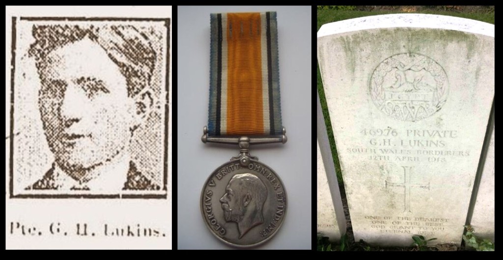George Henry Lukins was born in Pontypridd in 1899, one of fourteen children born to Walter William Lukins, a coal miner and later a brake fitter, originally from Taunton, Somerset, and Catherine Lukins née Niblett, originally from Cardiff. At the time of the 1901 census the Lukins family lived in Pontypridd. They moved to Cardiff around 1905 and lived in 167 Pearl Street. Before the war George was employed as an electrical engineer by Cardiff Corporation. He enlisted around the start of 1917 and went to France early 1918. He was killed in action on the 12 Apr 1918, aged 19. On the 11th and 12th Apr 1918 the 2nd South Wales Borderers suffered the full brunt of German attempts to capture the rail head of Hazebrouck. Ultimately the 2nd SWB was eventually taken in the flank and surrounded during a stubborn rearguard action. Only 150 Borderers escaped this invaluable delaying action. He is buried at La Kreule Military Cemetery Hazebrouck (grave I. A. 22). His grave carries the epitaph ‘One of the dearest, one of the best, God grant to you eternal rest’. George Lukins in commemorated on the Cardiff Corporation employees memorial in City Hall. Commonwealth War Graves Commission record. His father and two brothers served and survived the war.