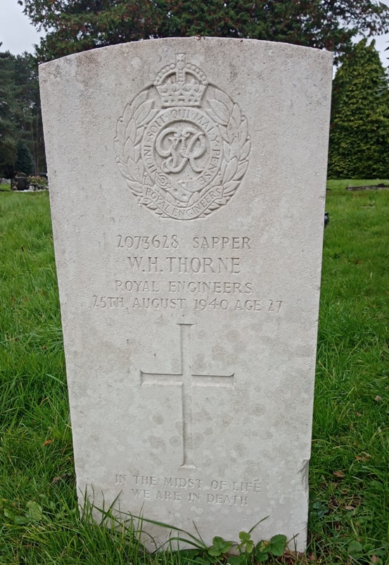 William ‘Willie’ Henry Thorne was born in Cardiff in 1913 to William Henry Thorne, a patent fuel worker, originally from Wellington, Somerset, and Amy Eliza Thorne nee Jenkins originally from Cardiff. Willie married Winifred Hyldred Latham in 1937 in Cardiff who went on to have two children and lived they lived at 48 Dogfield Street, Cathays. He joined the bomb disposal section of the Royal Engineers but died on 25 Aug 1940 aged 27. He was killed when a bomb he and colleagues were working on at the back of 117 Welwyndale Road in Sutton Coldfield, Birmingham exploded. Seven men with a Royal Engineers bomb disposal unit were killed together with four residents and two home guard. They were digging down to the bomb when they heard a fizzing sound, which one water board official attributed to a burst main, but the bomb exploded. One report states that three bombs exploded and another that the bomb responsible was a delayed action bomb. He is buried in Cathays Cemetery (EJ 2348). Commonwealth War graves Commission record. His brother Robert Charles Thorne was killed in the Holland in 1945.