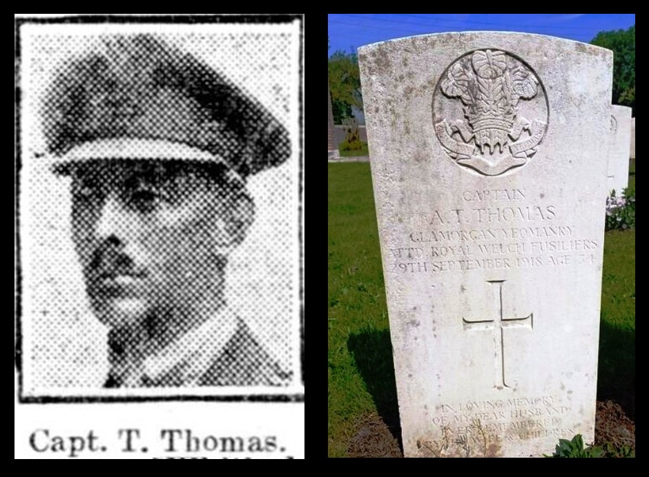 Arthur Tudor Thomas was born in 1883 in Sully, Glamorgan to William Thomas, a farmer, originally from Marcross, Glamorgan and Annie Thomas née Powell, originally from Pen-y-vai, Glamorgan. In 1891 the Thomas family were living at Cog Farm, Sully. Arthur attended Penarth Grammar School in the year it opened, 1897, and left in 1899. In 1901, Arthur, aged 17, still living at Cog Farm, was working as a Shipping Clerk. In 1909 he married Florence Mary Stark, from Cogan, Penarth. They lived at 15 Mafeking Road, Pen-y-lan and Arthur worked as a Valuer at the Inland Revenue department. They had two children, Glynne b.1910 and Enid Florence b.1912. In WWI he served as a Captain in the Glamorgan Yeomanry attached to the 24th Battalion Royal Welsh Fusiliers. He died from wounds on 29 Sep 1918, aged 34, on the Western Front. He is buried at the Pont-d’Achelles military cemetery, Nieppe, France (plot III.D.1). A letter to his widow from his commanding officer records ‘Your husband was one of a happy family of officers. Everyone liked him. The men would follow him anywhere. i.e. knew no fear, and was always ready and willing to undertake any enterprise. He was a born leader in action’. His newspaper obituary also records that prior going to France Capt. Thomas served for two years in Palestine. Commonwealth War Graves Commission record. He is remembered on the Penarth County School WWI Memorial. In 1942 his daughter Enid Florence Thomas married RAF Group Captain Gordon Hugh Everitt CBE, DSO, DFC and Bar.