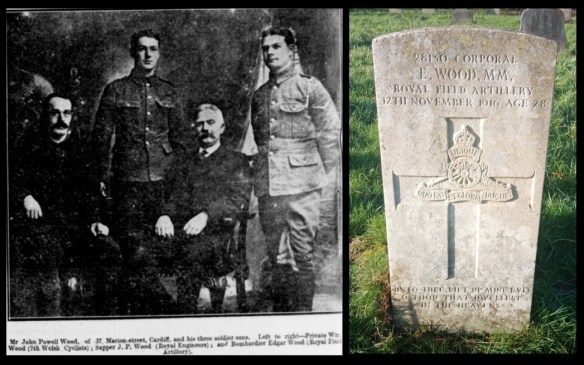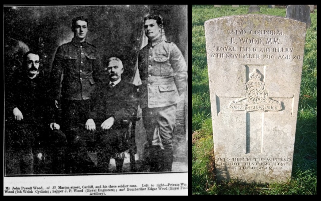 Edgar Wood was born in Cardiff on 12 Feb 1889 to John Wood, a coal trimmer, originally from Upper Cwmbran, Monmouthshire and Janette Wood née David, originally from Cowbridge, Glamorgan. In 1891 the Wood family were living at 16 Coveny Street, Splott. When he was registered to attend Albany Road School in 1893 they were living at 135 Glenroy Street, Roath. In 1901 they were at 21 Walker Road, Splott and in 1911 at 37 Marion Street, Splott and Edgar was working as a Locomotive Fireman for the Rhymney Railway Company. In WWI he served as a Corporal with C Battery, 93rd Brigade, Royal Field Artillery. He was injured in the Battle of the Somme by gun shot on 29 Oct 1916 and taken to the military hospital in Rouen where he was described as seriously ill. He was returned to England but died of his wounds later in the 2nd Western General Hospital, Manchester on 12 Nov 1916, aged 28. His body was returned to Cardiff and he is buried in Cathays Cemetery (grave V 782). He was awarded the Military Medal, circumstances unknown. His mother received it in Jul 1917 in a ceremony in Westgate St. He is remembered on the Splott War Memorial. Commonwealth War Graves Commission record.