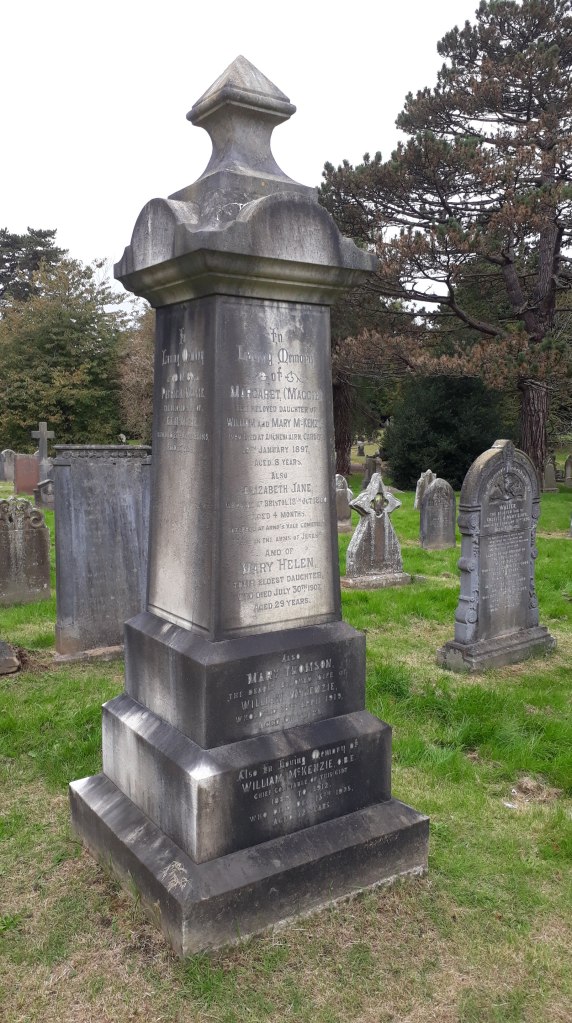 McKenzie Grave at Cathays Cemetery Published October 10, 2018 at 1824 × 3264 in McKenzie Grave at Cathays Cemetery The McKenzie grave in Cathays Cemetery (plot number M329/M 313. The grabe contain William McKenzie and is wife Mary, two of their children; Margaret and Mary (with mention of Elizabeth interred in Bristol) and their daughter in law, Patricia.