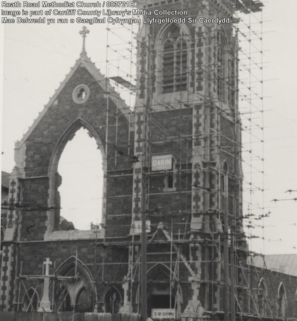 Roath Road Wesleayan Methodist damaged with scafolding Published November 30, 2018 at 1008 × 1088 in Roath Road Wesleayan Methodist damaged with scafolding The bomb damaged church with scaffolding erected. Evidently it was decided not to repair the church subsequently and demolish the remains. But what happened to the war memorial?