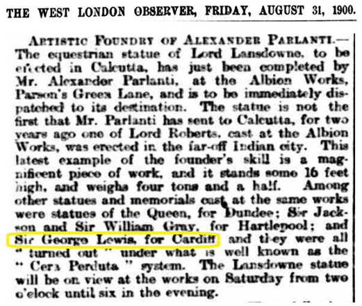 What we are looking for is a fourth casting. In the West London Observer of 31 Aug 1900 there is a list of pieces made at the Alexander Parlanti foundry including “Sir George Lewis for Cardiff”. Given the dates the foundry existed it is believed this must have been referring to a cast made some time between 1890 and 1900.