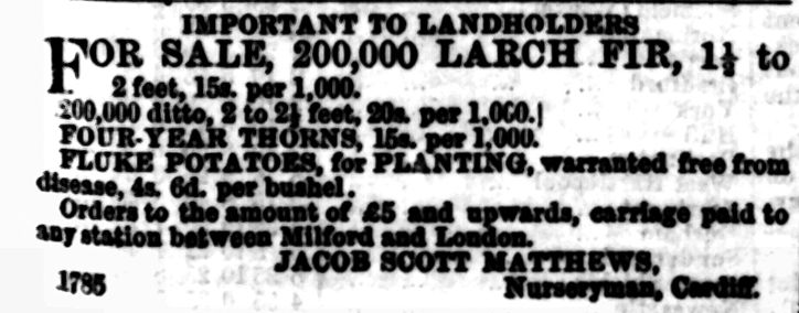 Jacob Scott Matthews was born in Cardiff in 1817. He married Elizabeth Brown in Bristol in 1847. Jacob Scott Matthews took over his father Samuel Matthews successful nursery in 1847 developing it into the premier nursery in Cardiff. It was to Jacob that JH Insole turned for the trees, for the initial planting of Ely Court (Insole Court). Jacob and Elizabeth lived at Station Terrace near the Taff Vale railway station.