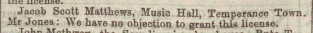 1880 – Newspaper reports the death of Jacob Scott Matthews referencing his strong support to the temperance principles.Music Hall licence granted to Matthews in 1862