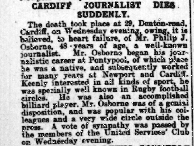 Philip John Osborne, the journalist, was born in Pontypool in on 5 Oct 1866, youngest son of Edwin Osborne, a baker, and Mary Ann Osborne née Parsons. Looking at the 1881 census record we see that at the age of 14 he is at home and a newspaper clerk. In the 1891 census he is also living with his parents in Pontypool and a newspaper reporter. That still left him time in theory to have moved to Cardiff in the 1880s, worked as a clerk, stolen the gold, served his 9 months prison sentence and be back in Pontypool for the 1891 census. In 1901 he is lodging in Newport and working as a journalist and author. In 1911, as we know, he was living in Riverside, Cardiff and had married Elizabeth Grey.